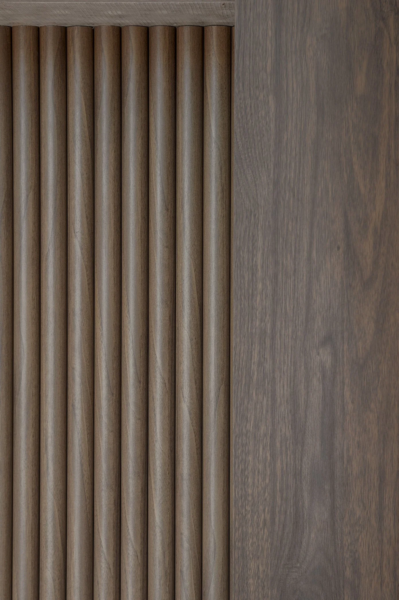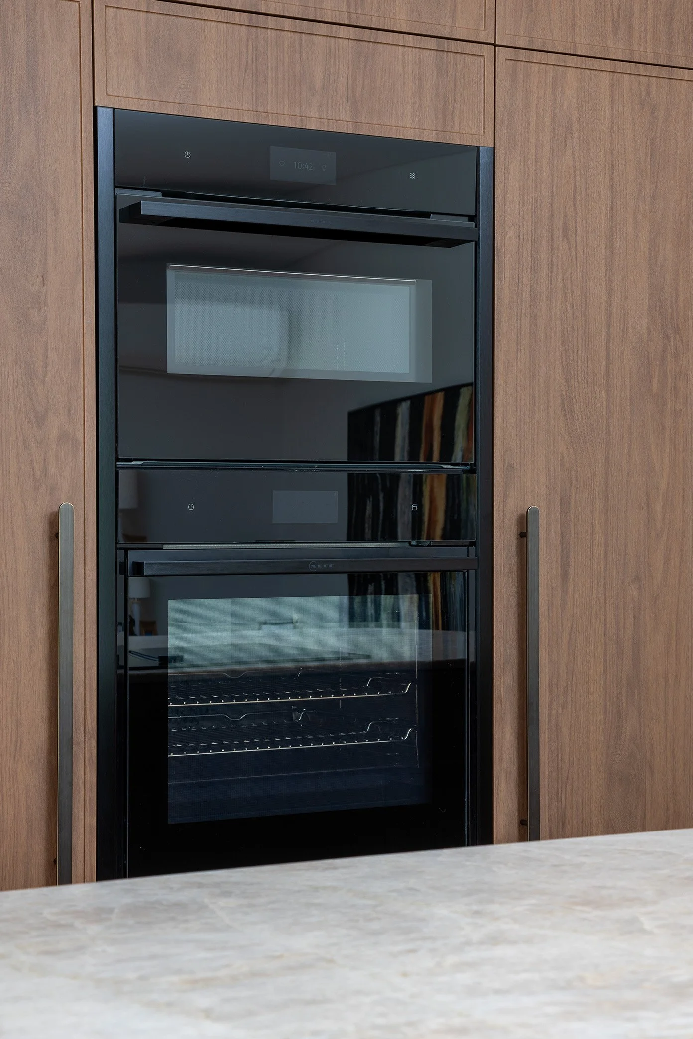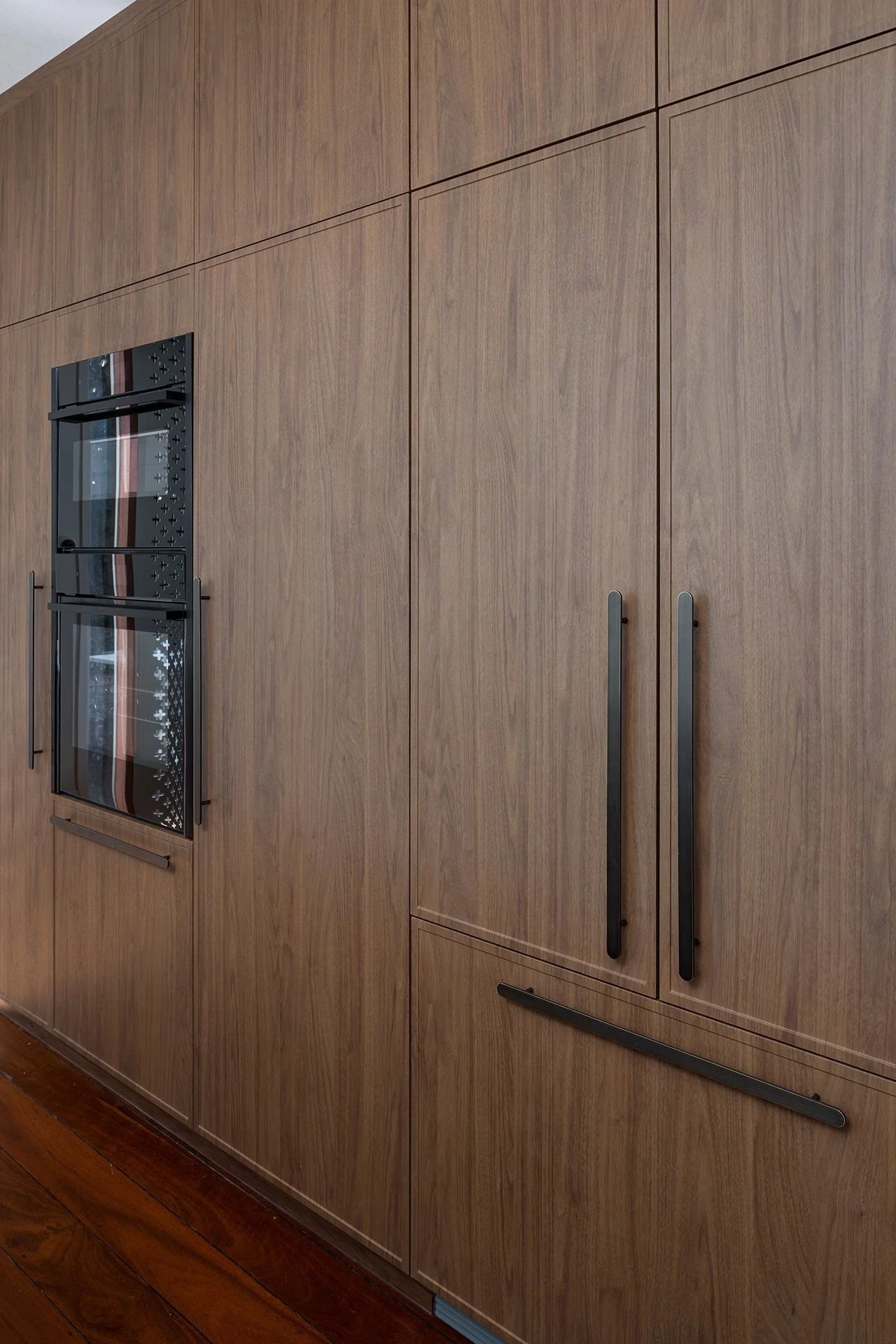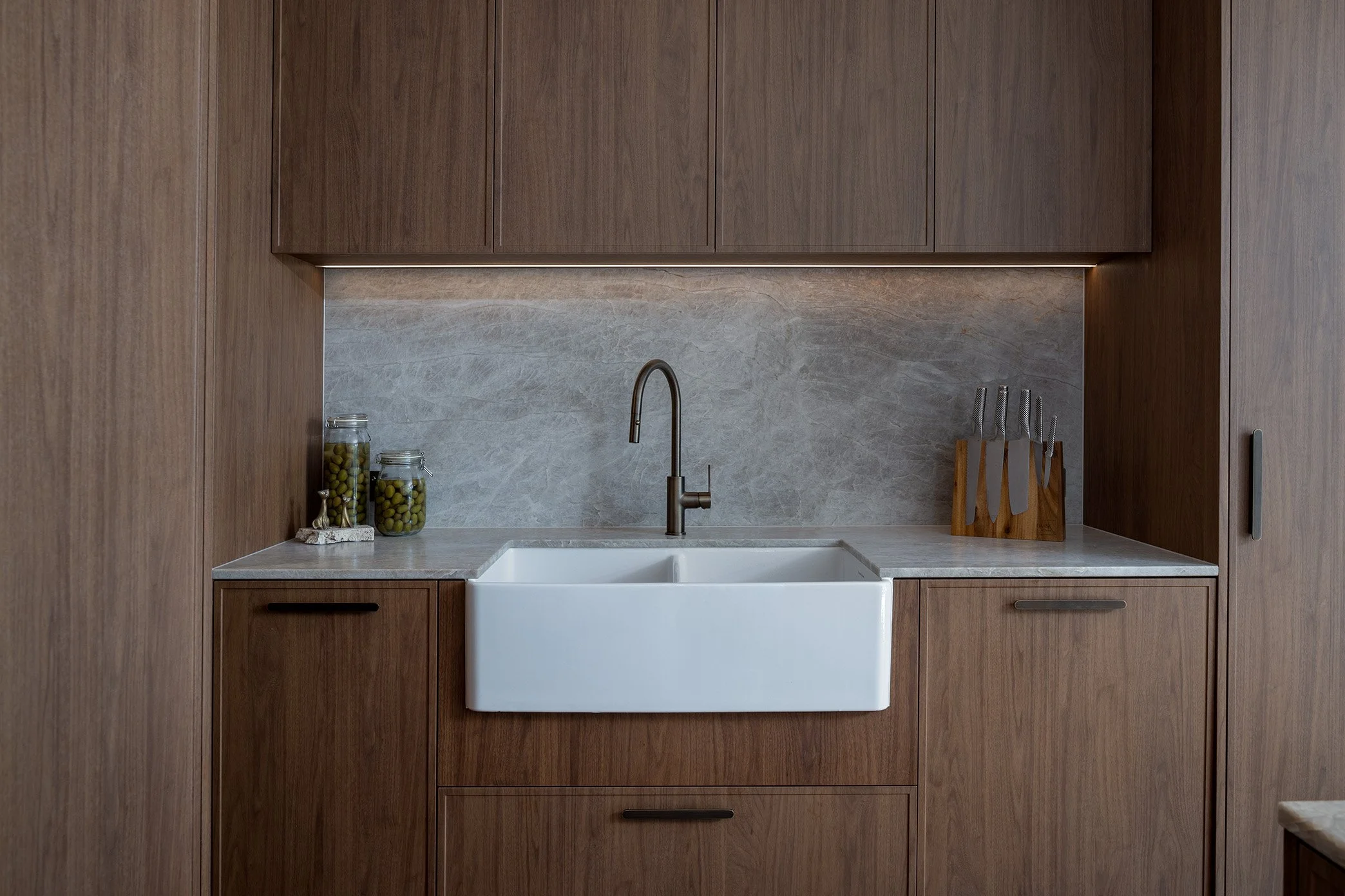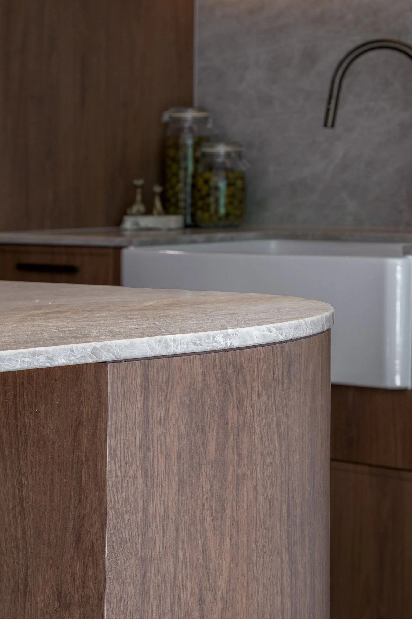 The finished result is a kitchen that feels both refined and inviting. Florentine Walnut Woodmatt cabinetry sets a warm, sophisticated tone, while elegant curved details soften the overall look and add a sense of flow. Integrated appliances keep the design seamless and uncluttered, allowing the materials and craftsmanship to shine.
